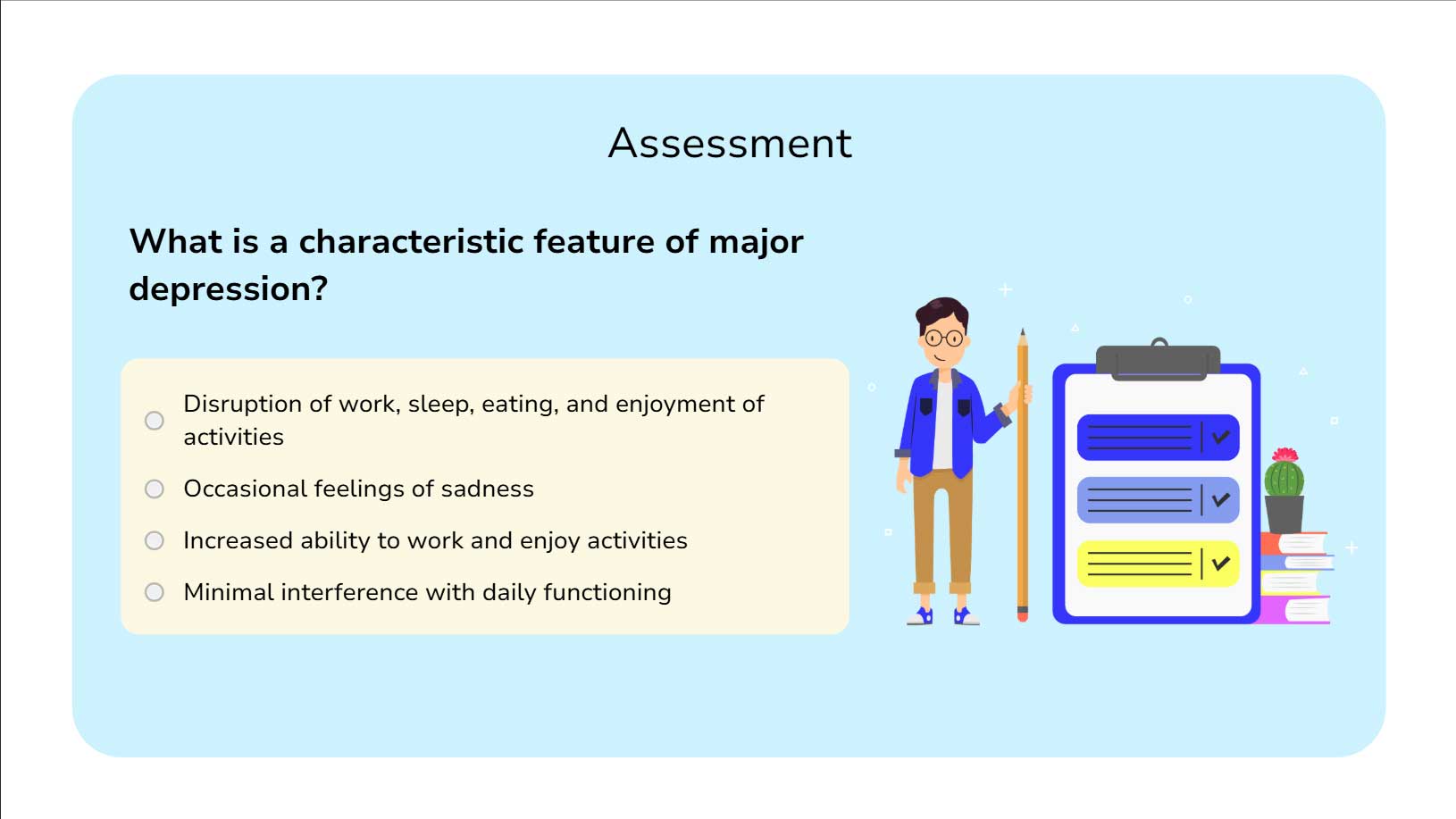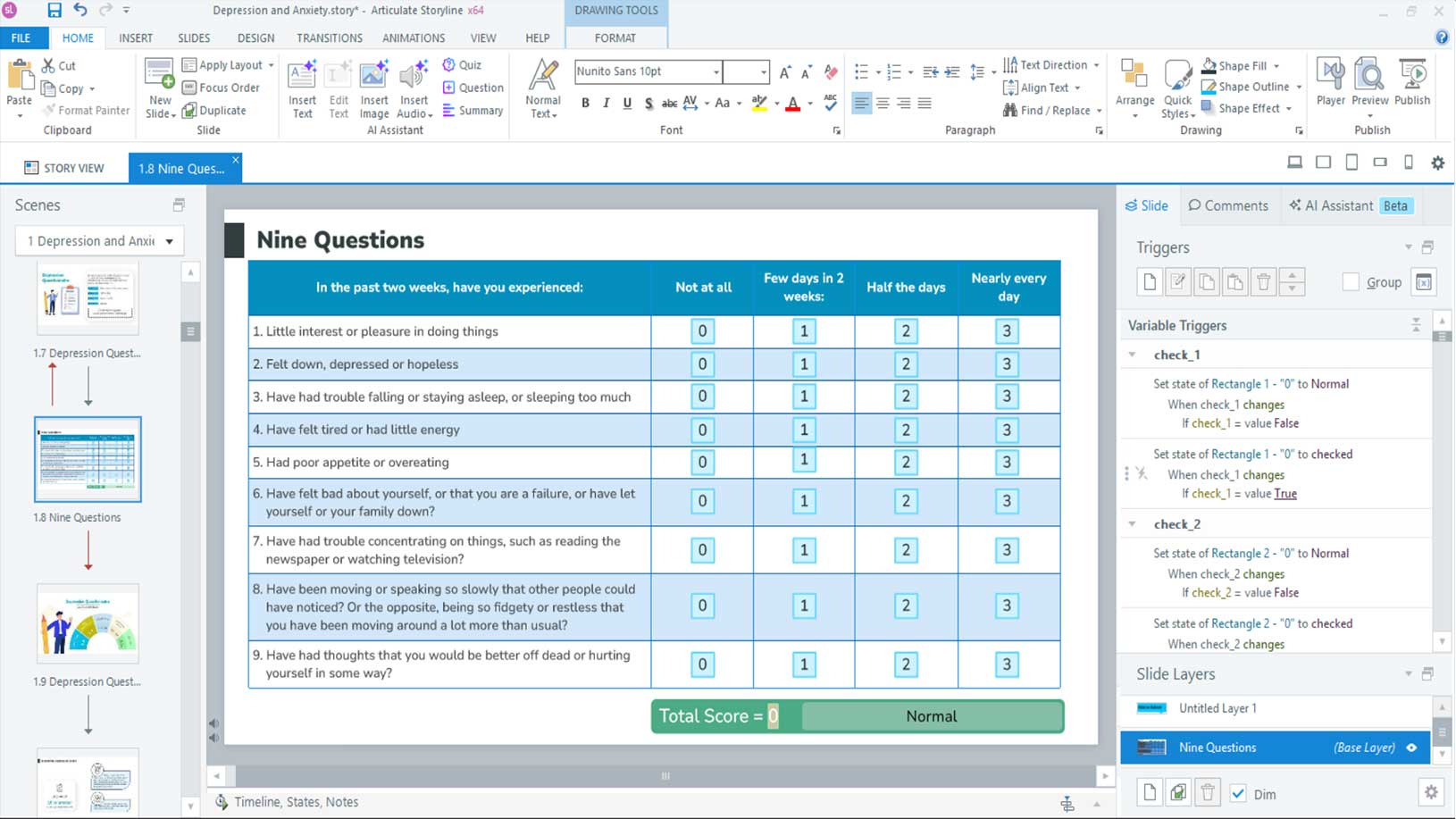 I converted a static 9-question clinical tool into a functional, private self-assessment. Learners receive a real-time “Depression Score” based on their inputs, moving the abstract clinical data into a personalized tool.