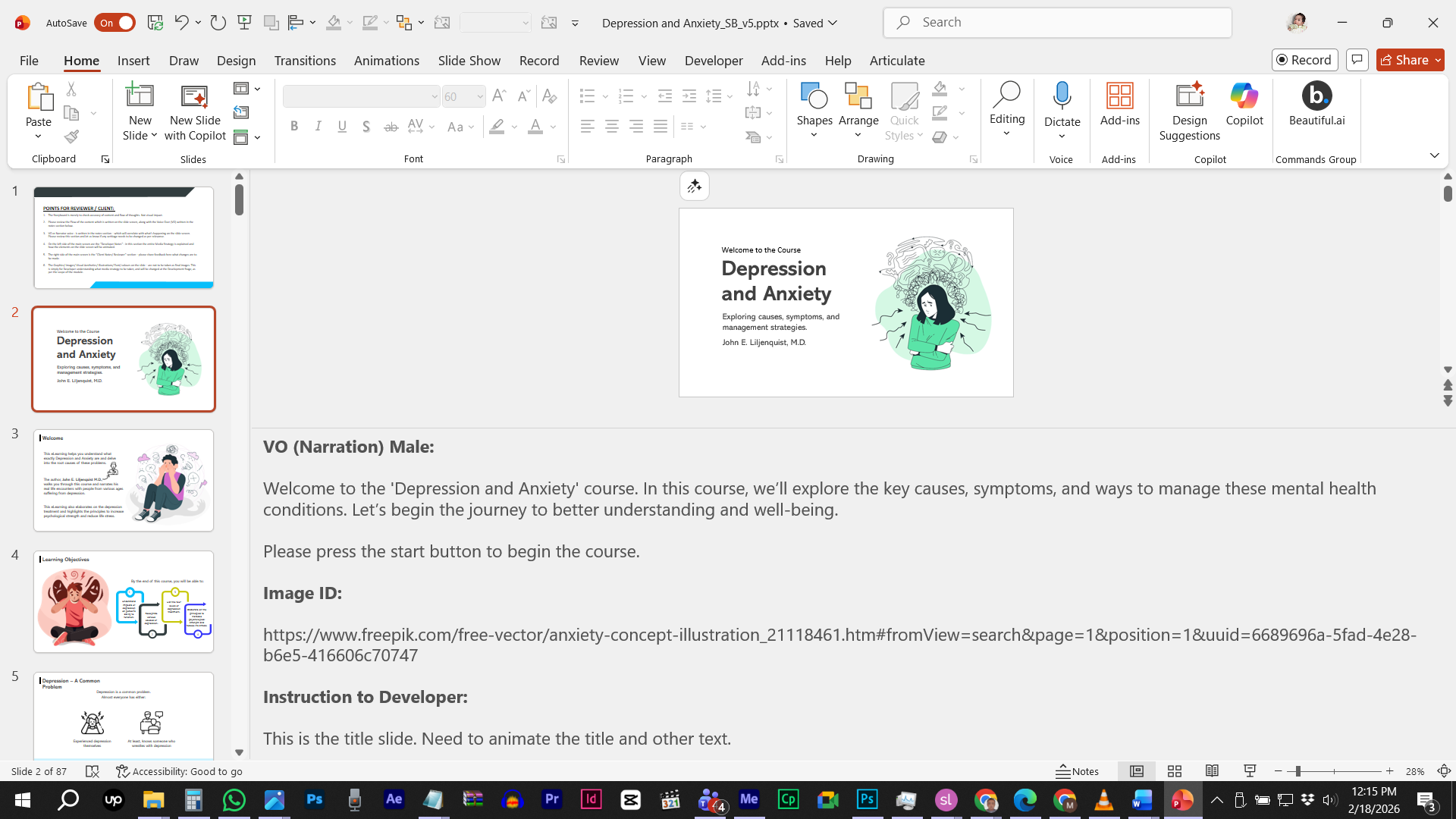 Before touching Storyline, I built a detailed storyboard in PowerPoint. This served as the blueprint for the client, mapping out narration (VO) and the “Media Strategy” for every slide.